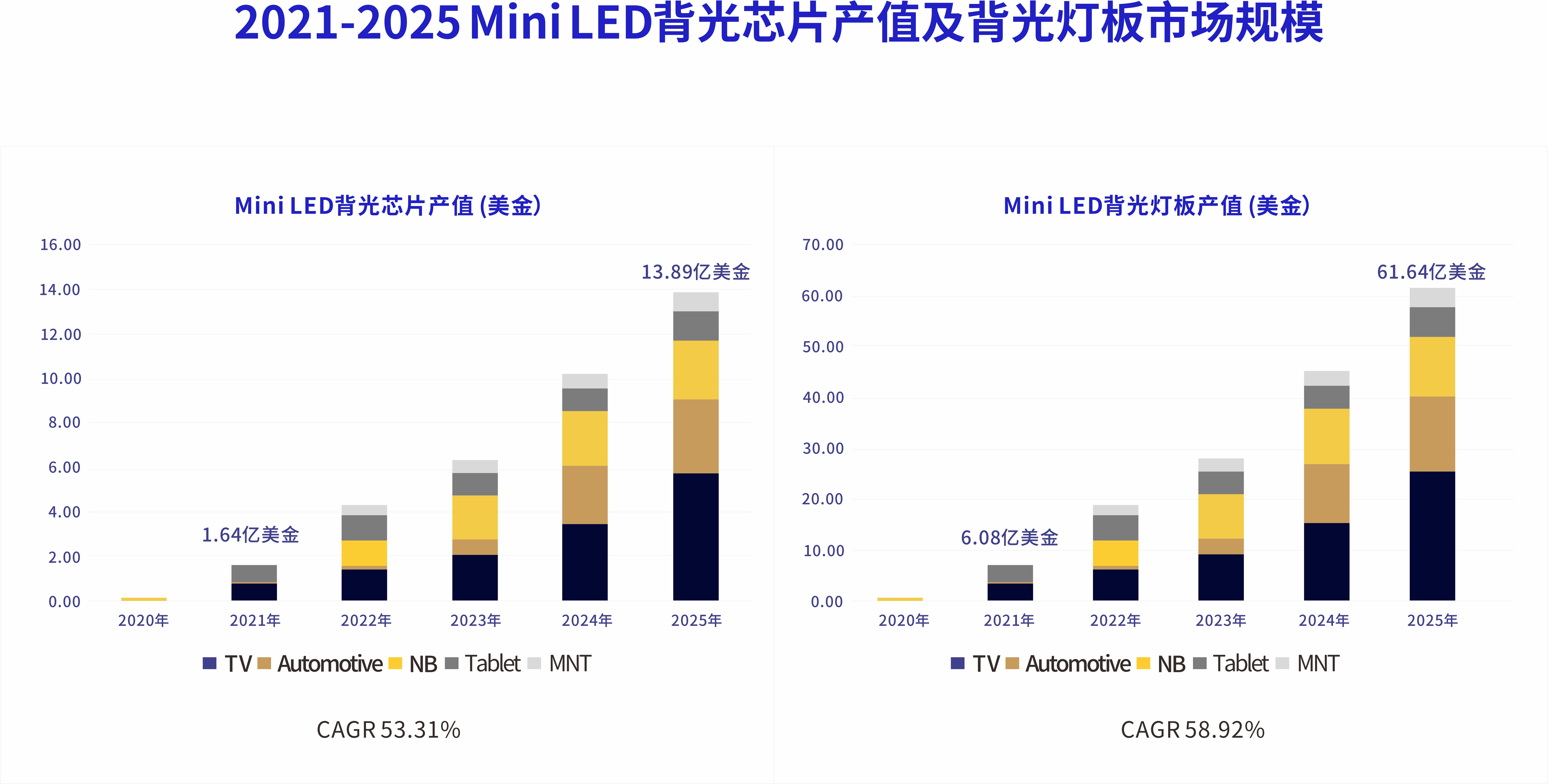 在終端產(chǎn)品頻頻發(fā)布的同時(shí),產(chǎn)業(yè)鏈上下游積極響應,Mini LED背光產(chǎn)品有望進(jìn)一步放量。據行家Research預測,至2025年,Mini LED背光芯片總產(chǎn)值將達到13.98億美金,Mini LED背光燈板產(chǎn)值將達到61.64億美金?;趯舭孱A測,可以推知,Mini LED背光模組的產(chǎn)值約有百億。